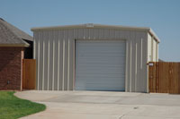 This simple residential steel building includes one 10 x 10 overhead door and a single entry door at the buildings rear. The wall color is light stone with white roof and saddle tan trim.